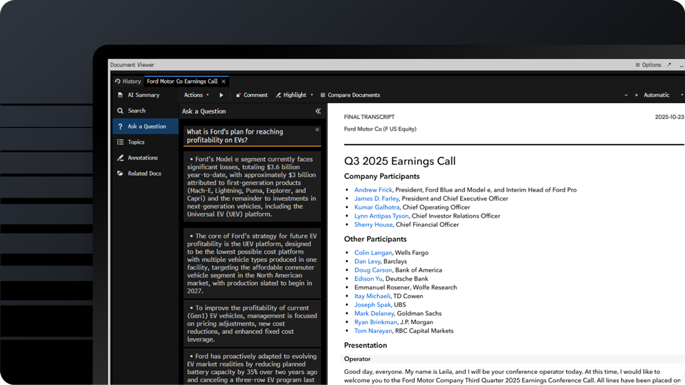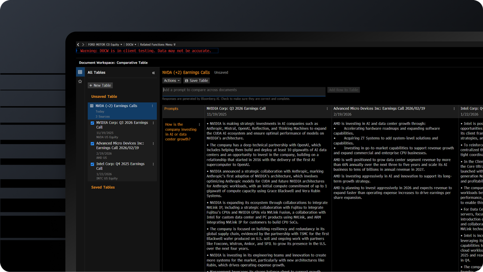 Search hundreds of millions of documents, including company transcripts, sell-side research, news and proprietary Bloomberg content, and summarize key insights. Document Search helps you uncover the details that explain what a company does, how it operates and how it’s changing, then extract cited text and data to verify assumptions in research notes.